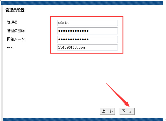 设置管理员账号和密码;密码必须8位,数字+英文;然后点击下一步