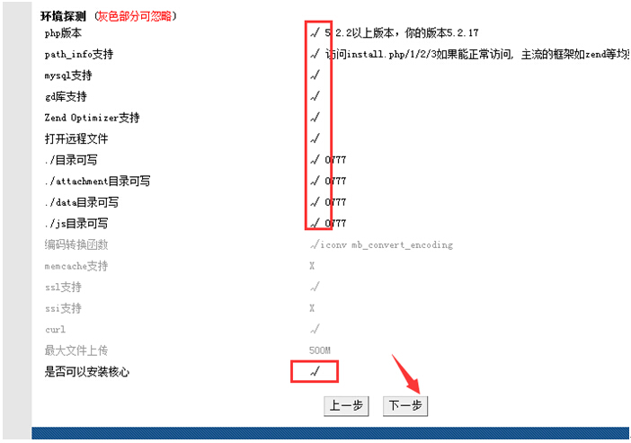 出现相关的安装环境提示,深黑色的地方必须打钩才能安装,如果里面 任意一项不支持,就会提示核心无法安装,从而无法安装网站。浅灰色的是可选的,不一定要支持。