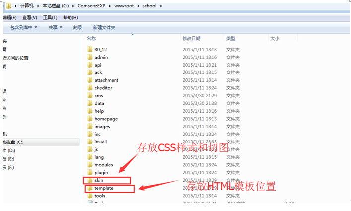 打开school目录---可以看到skin和template文件夹;所有模板均只与这两个模板文件夹有关,他的变动不影响程序的运行,只会影响模板样式。